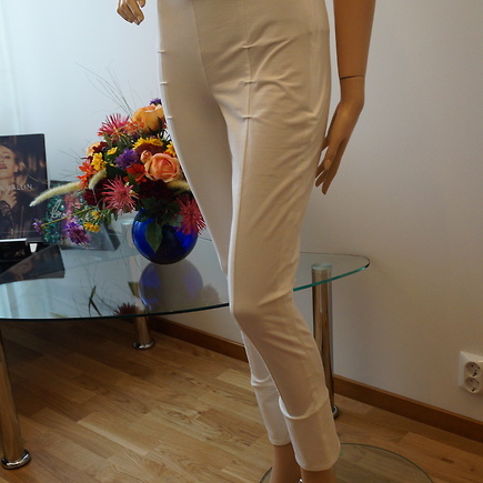 Dragkedjor på vänstra sidan och två i benslut baksidan. Normal midjehöjd. Smala ben. Eko-certifierade. Innehåller inga skadliga färgämnen.